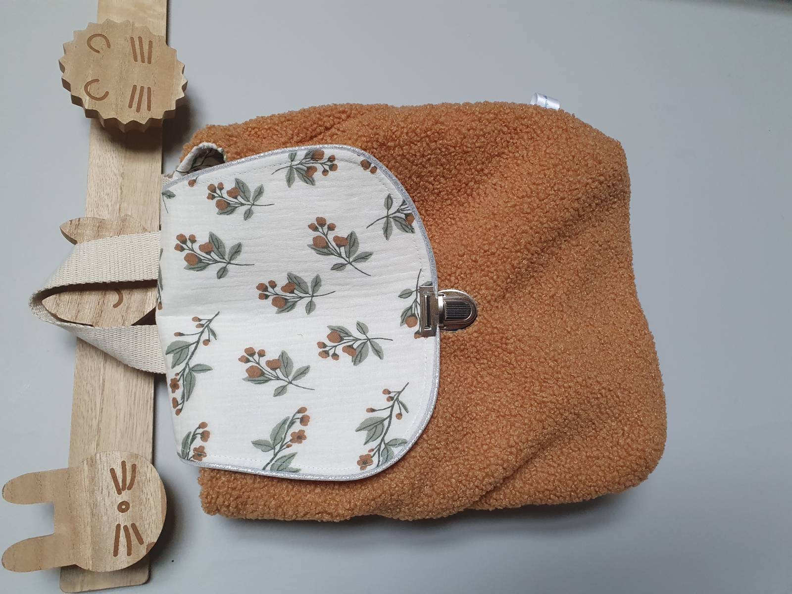 En tissu double gaze fougère et tissu bouclette camel.
